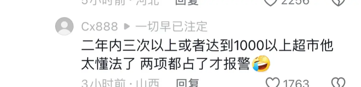@Cx888: 二年内三次以上或者达到1000以上超市他太懂法了 两项都占了才报警