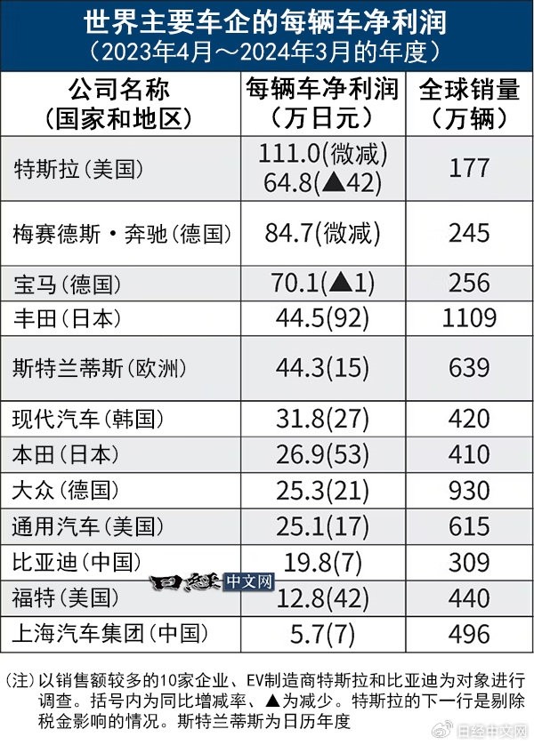 数据显示,特斯拉单车净利润最高,达到111万日元(约合4.9万元人民币)。紧随其后的是奔驰、宝马和丰田,单车净利润分别为84.7万日元(约合3.8万元人民币)、70.1万日元(约合3.1万元人民币)和44.5万日元(约合1.8万元人民币)。此外,现代、本田和大众也进入了前十名榜单。其中比亚迪和上海汽车集团入榜,对应单车净利润为19.8万日元(约合8,400元人民币)和5.7万日元(约合2,565元人民币)。