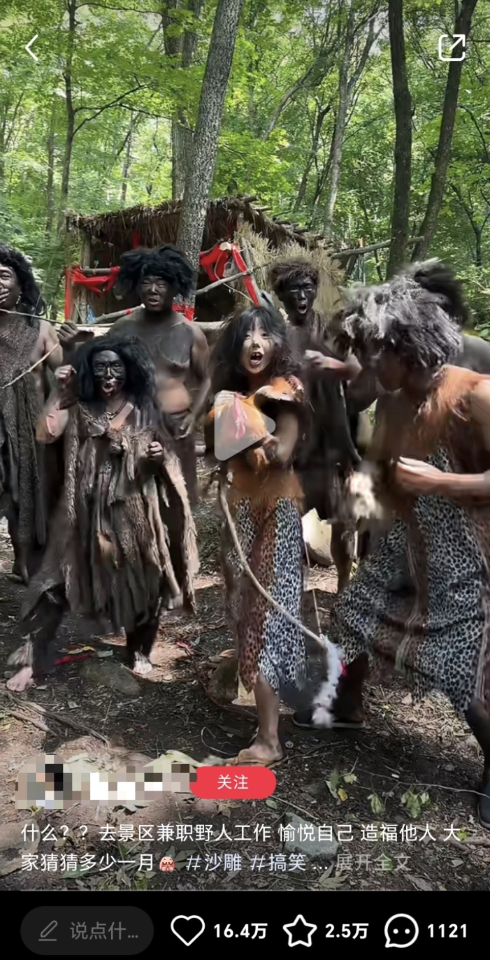 近日,有网友在社交平台分享去景区兼职“野人”的视频,并配文“愉悦自己,造福他人”。
