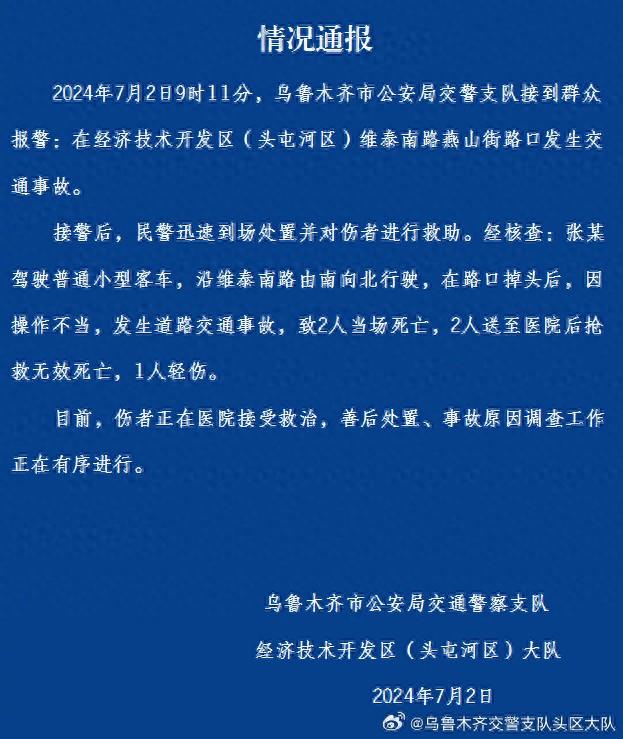 乌鲁木齐交警支队头区大队通报,7月2日9时11分,乌鲁木齐市公安局交警支队接到群众报警:在经济技术开发区(头屯河区)维泰南路燕山街路口发生交通事故。接警后,民警迅速到场处置并对伤者进行救助。经核查:张某驾驶普通小型客车,沿维泰南路由南向北行驶,在路口掉头后,因操作不当,发生道路交通事故,致2人当场死亡,2人送至医院后抢救无效死亡,1人轻伤。目前,伤者正在医院接受救治,善后处置、事故原因调查工作正在有序进行。