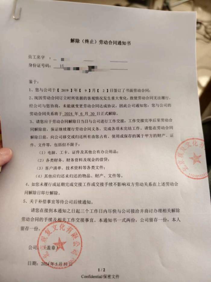 公开信息显示,在北京观复文化有限公司(以下简称:北京观复),马未都持股超过95%。7月1日,新黄河记者联系到上述博主张先生,他介绍,解除(终止)劳动合同通知统一发给了多个部门的大部分同事,并标明劳动合同关系将于2024年6月30日解除。