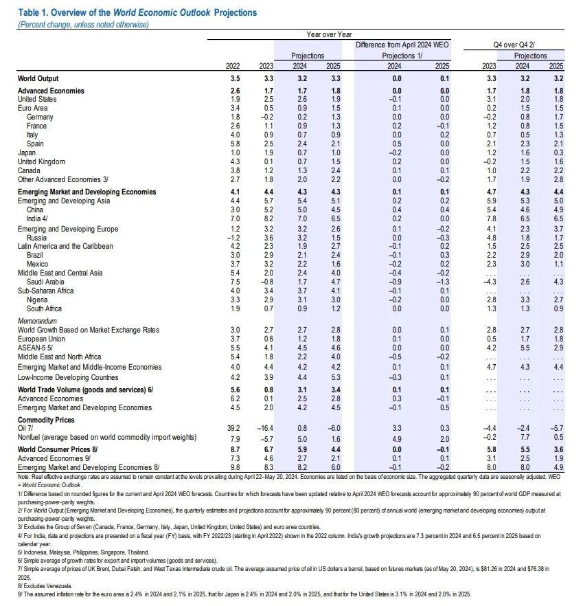 国际货币基金组织(IMF)在最新的2024年7月《世界经济展望报告》(WEO)中维持了4月WEO对全球经济增速的预期,预计全球经济将分别在2024年和2025年录得3.2%和3.3%的增幅。IMF将中国今年的经济增长预测上调至5%,较4月的预测值高出0.4个百分点。