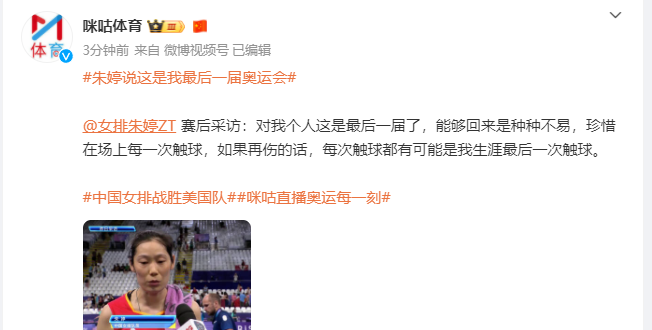 赛后接受采访时,朱婷透露巴黎奥运会是她最后一届奥运会,她表示:“对我个人这是最后一届(奥运会)了,能够回来是种种不易,珍惜在场上每一次触球,如果再伤的话,每次触球都有可能是我生涯最后一次触球。”