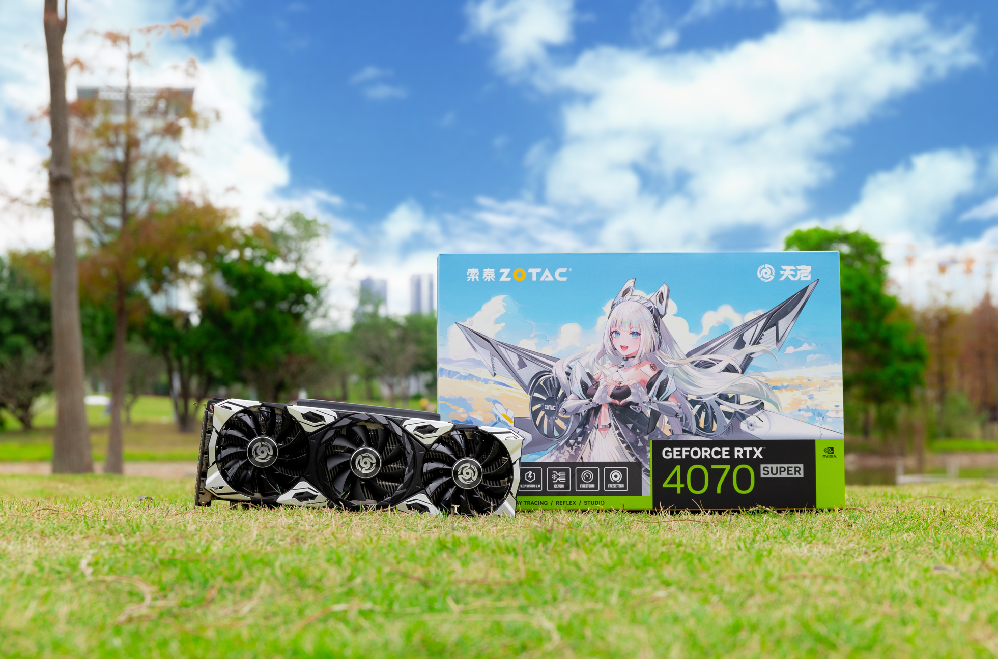我们下面给大家介绍几个热门型号。首先介绍由索泰天启姬倾情代言的RTX4070 SUPER 天启OC显卡。这款显卡拥有天启系列经典的外观造型,采用AD104核心,配备7168个流处理器和12GB GDDR6X显存,使用了三风扇散热设计,并配备大面积金属散热背板以及高密度镀镍鳍片,保证高压稳定性能释放,是一款兼具颜值和性能的中高端显卡。