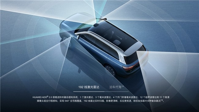 在驾驶辅助方面,该车搭载华为高阶智驾HUAWEI ADS 2.0及麒麟9610A辅助驾驶芯片,芯片的CPU算力可达200kDMIPS,较骁龙8155芯片提高了近一倍。配备1个激光雷达(192线)、3个毫米波雷达、12个超声波雷达和11个高清摄像头组,能够实现540°全范围覆盖,对环境信息的反馈丰富且清晰,所具备的避让/辅助通过能力强。