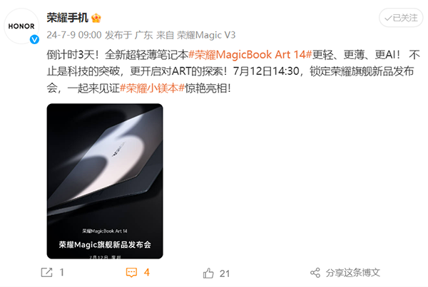 本文属于原创文章,如若转载,请注明来源:还有3天 荣耀高端旗舰新品MagicBook Art 14将迎来首秀https://ai.zol.com.cn/883/8830243.html