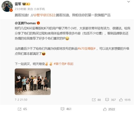 小米科技创始人雷军也转发了王腾的微博,并为其打气:“腾哥加油!”此前,雷军还突击检查了王腾上任Redmi品牌总经理以来的“第一份作业”,对王腾的工作给予了肯定。