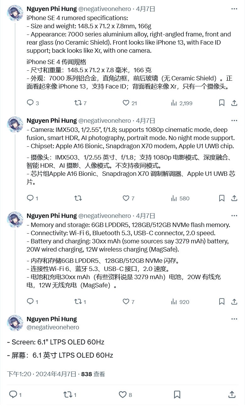 iPhone SE 4将配备与iPhone 14标准版相同的3279mAh电池,支持20W有线快充。这一配置确保了设备的续航能力,满足用户日常使用的需求。