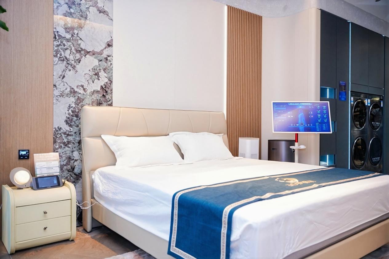 来到三翼鸟智慧家一居室体验区,更是让人眼前一亮。这里将家庭空间玄关、厨房、阳台、客厅、衣帽间、卧室、浴室一一还原,逛展如逛家。打开房门,玄关灯光亮起,窗帘关闭,电视打开,热水器已经调到适宜的温度,伴随着舒缓的音乐进入客厅,说一句“我要看电影”,灯光变暗,搭配专业画质和音响,看电影更有沉浸感,看累了到卧室休息,躺在床上说“小优小优,我要睡觉了”,灯光变暗,音乐减弱引导睡眠,睡觉时,双区零圧床垫贴合人体曲线,让睡眠更舒适……