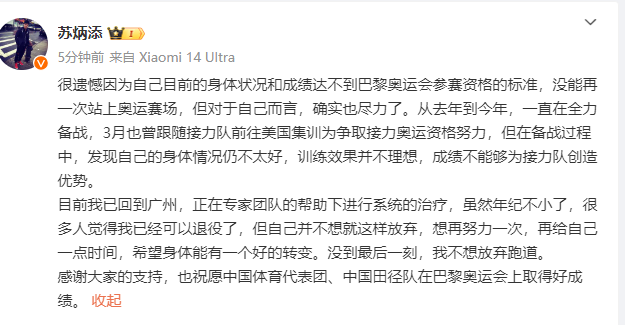 今天早上,苏炳添在社交媒体上再发声。苏炳添表示,虽然已经确认无缘巴黎奥运会,但是自己还不想放弃跑道,还想给你一点时间。
