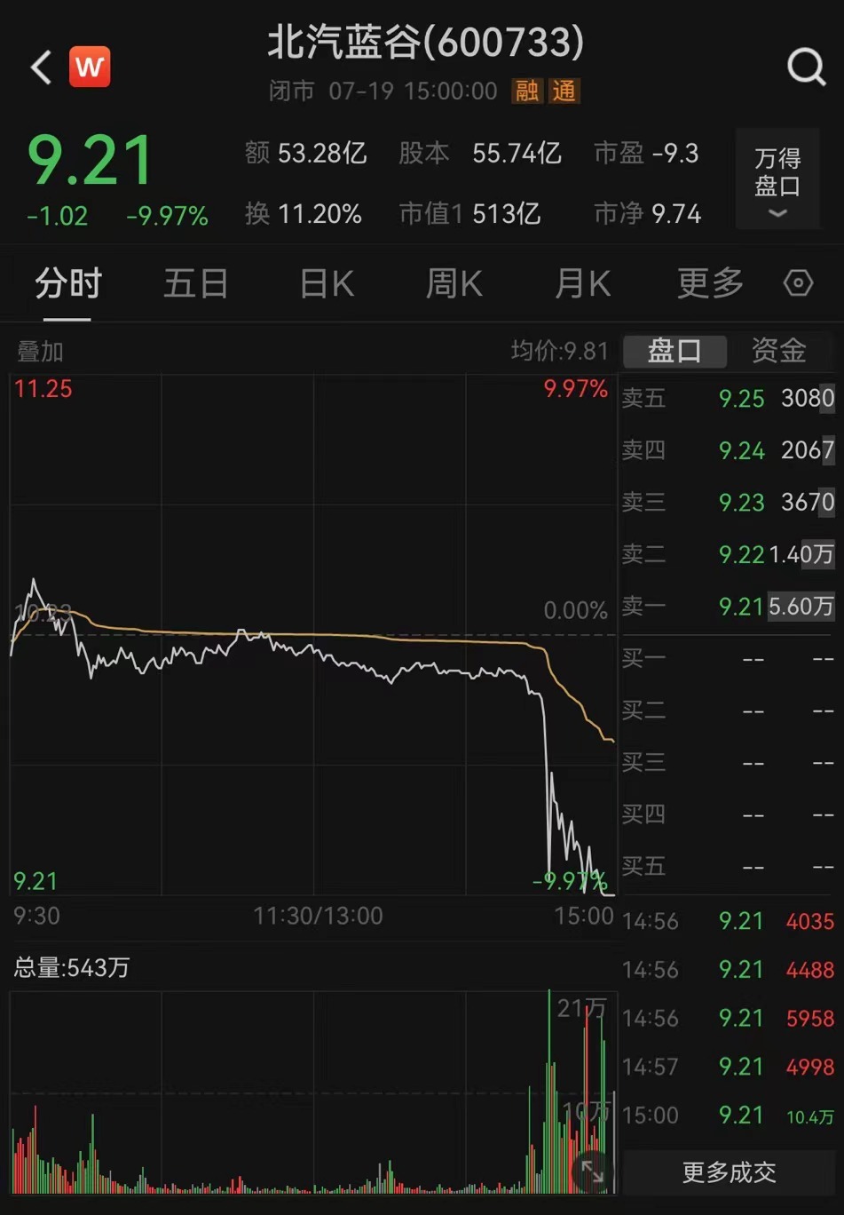今天(7月19日),北汽蓝谷股价尾盘断崖式下跌,并于盘末跌停,报9.21元。全天成交53.28亿元,换手率11.20%。