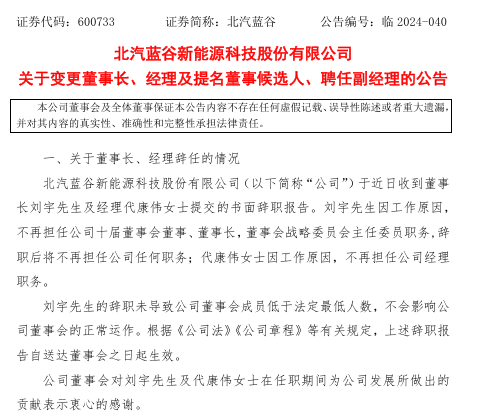 7月19日,北汽蓝谷(600733)发布公告,公司近日收到董事长刘宇及经理代康伟提交的书面辞职报告。刘宇因工作原因,不再担任公司董事、董事长等职务,辞职后不再担任公司任何职务;代康伟因工作原因,不再担任公司经理职务。董事会同意选举代康伟为公司董事长;同意聘任张国富为公司经理、聘任刘观桥为公司副经理。