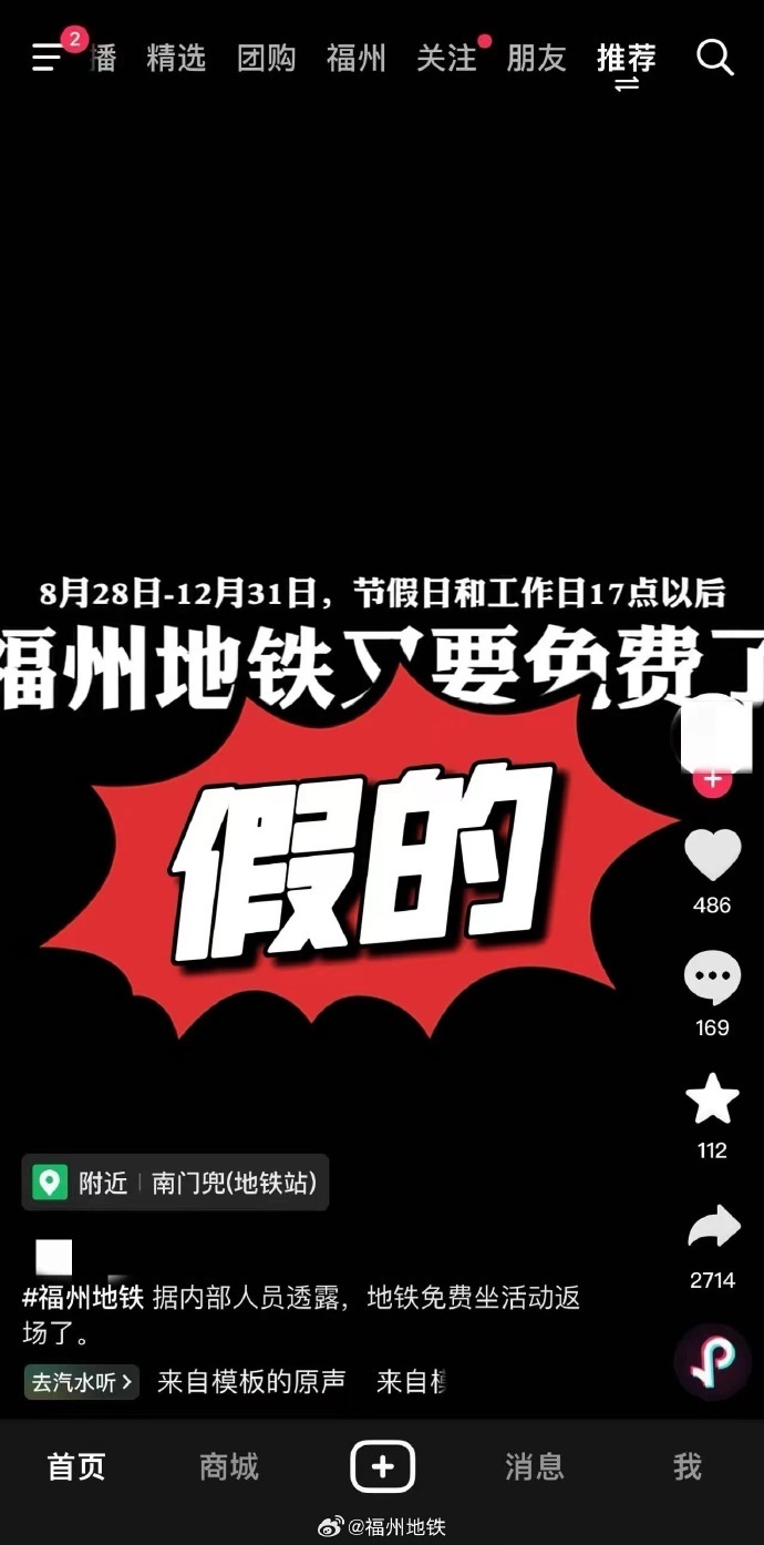 7月30日,福州地铁官方发文辟谣:近日有网民发帖称“福州地铁将于今年8月28日至12月31日开展免费乘车活动”,该信息不实。福州地铁暂无相关活动计划。