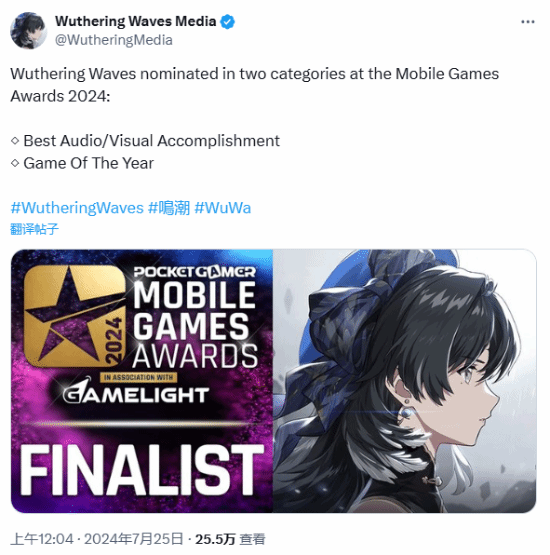 其中,《鸣潮》以其引人注目的音频/视效获得了最佳音频/视效的奖项提名,并且还将角逐年度最佳游戏这一重要奖项。而另一款名为《崩坏:星穹铁道》的游戏则因为其出色的叙事能力和卓越的音频/视效表现,也成功地获得了年度最佳游戏、最佳叙事以及最佳音频/视效三个奖项的提名。