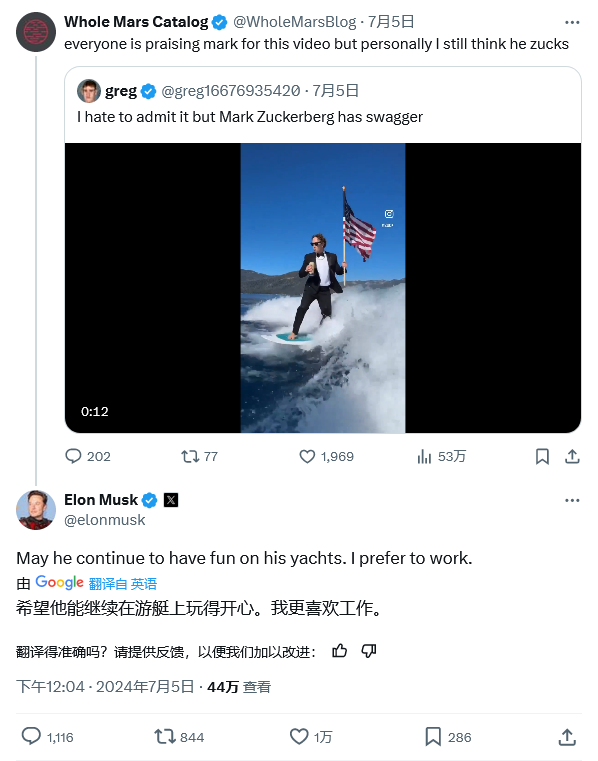 这位名叫greg的网友将这个视频分享到了一个名为X的平台上,在此之后,特斯拉CEO埃隆·马斯克回复道:“希望他能继续在游艇上玩得开心。我更喜欢工作。”