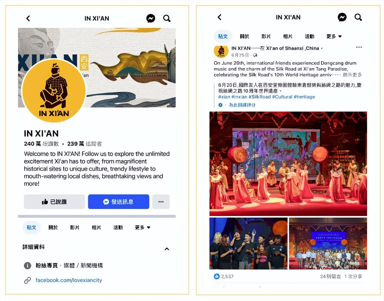 除此之外,各种精彩有趣的视频,经由“IN XIAN”(西安海外城市账号)发布,将西安的美食美景、历史风韵、城市风范推向世界。IN XIAN Facebook平台粉丝数目前已超过239万,点赞数也已超过240万。