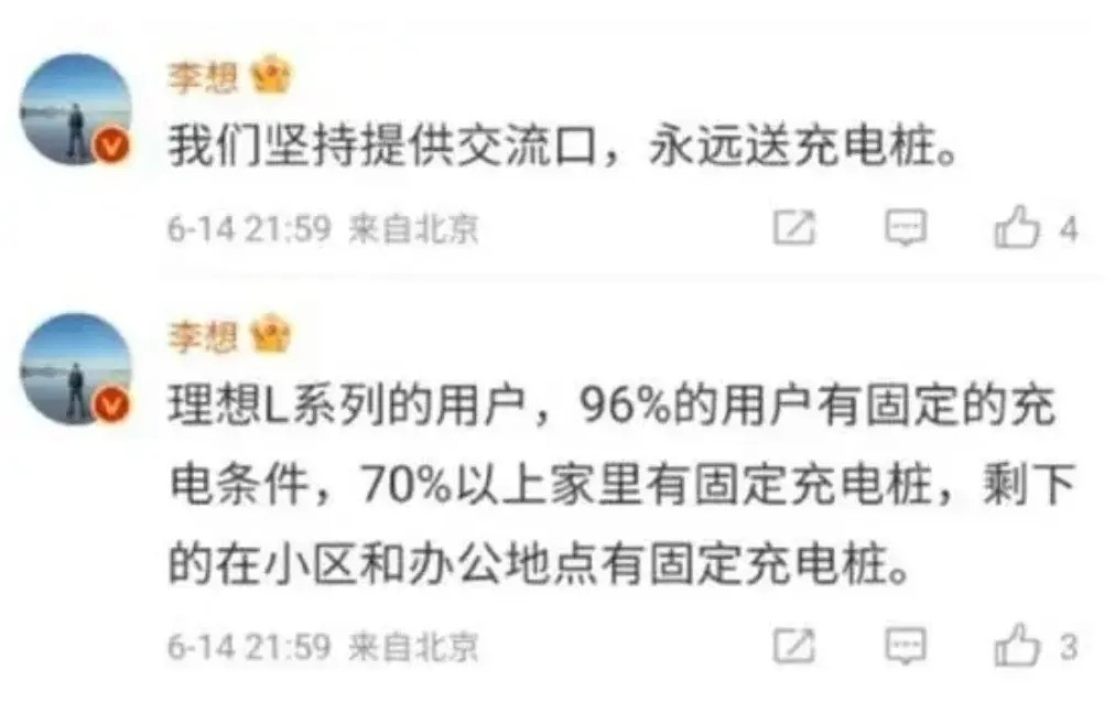 值得注意的是,在2023年6月14日时,理想汽车CEO李想曾表示:“我们坚持提供交流口,并永远送充电桩。”然而,在此之后该条微博已被删除。这或许预示着理想汽车在充电桩政策上将会进行重大调整。