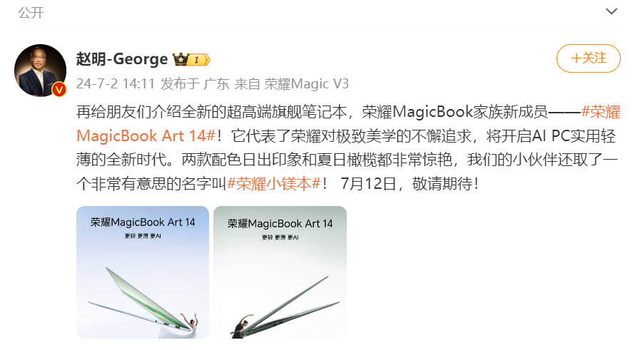 荣耀CEO赵明在微博中表示,“荣耀MagicBook Art 14在内部被称为‘荣耀小镁本’,代表了荣耀对极致美学的不懈追求。”此外,他还透露,在此次发布会上,荣耀将带来一款融合AI技术和用户体验的智能硬件产品,开启全场景构架下的人机交互和多端生态,并重构整个PC行业。