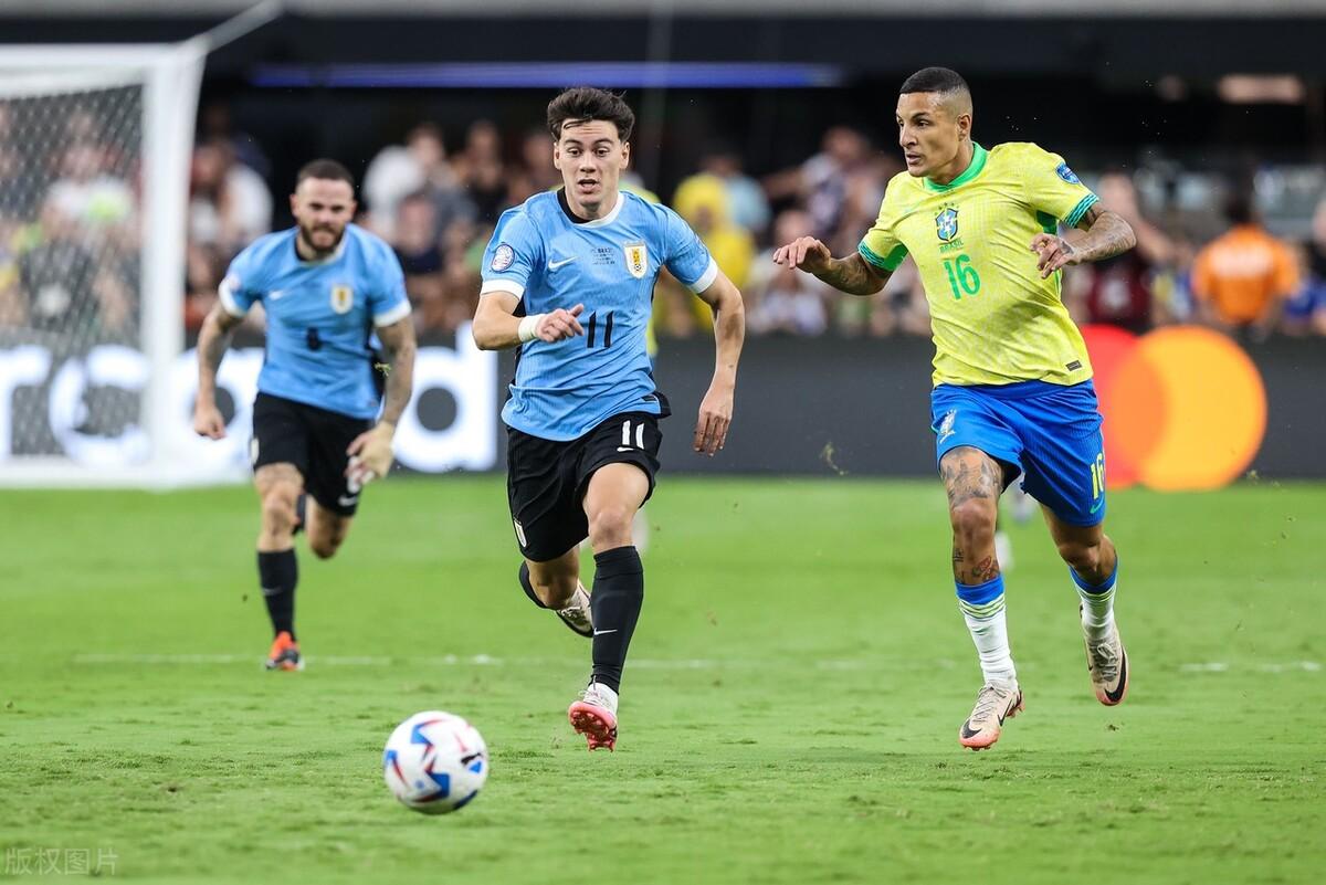 北京时间7月7日上午9时,2024年美洲杯最后一场1/4决赛在乌拉圭与巴西两队之间进行,比赛地点在美国拉斯维加斯。上半场,乌拉圭后卫阿劳霍伤退,努涅斯、拉菲尼亚错失破门机会;下半场,乌拉圭后卫南德斯铲抢犯规被红牌罚下,常规时间内两队战平。经过点球大战,乌拉圭4-2淘汰巴西,晋级四强,将在半决赛中对阵哥伦比亚。