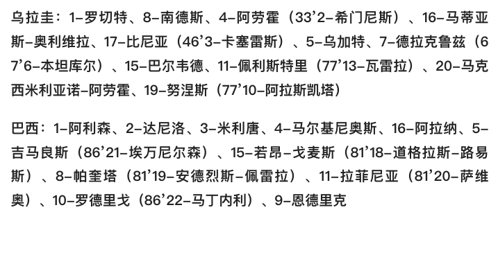 第36分钟,拉菲尼亚中路持球突入禁区单刀打门被乌拉圭门将罗切特挡出。第37分钟,巴西队获得禁区弧顶定位球,罗德里戈主罚直接打门被人墙挡出。