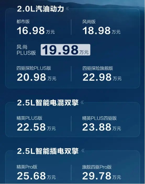 在动力方面,2.0L车型的最大功率为126千瓦,并且其两驱版WLTC综合油耗为6.27L/100km,而四驱版的百公里油耗有所上升至6.9L(PLUS版)或6.84L(普通版)。2.5L电混车型最大功率为160千瓦或163千瓦(四驱),而插电式混合动力版的最高输出功率可达194千瓦或225千瓦(四驱)。