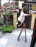 功夫不负有心人,小伙子终于把雨棚上的积水清理得干干净净。正当他沾沾自喜准备下梯子时,悲剧发生了。只见他脚下一滑,重心不稳,整个人就像断了线的风筝,直挺挺地从梯子上栽了下来。