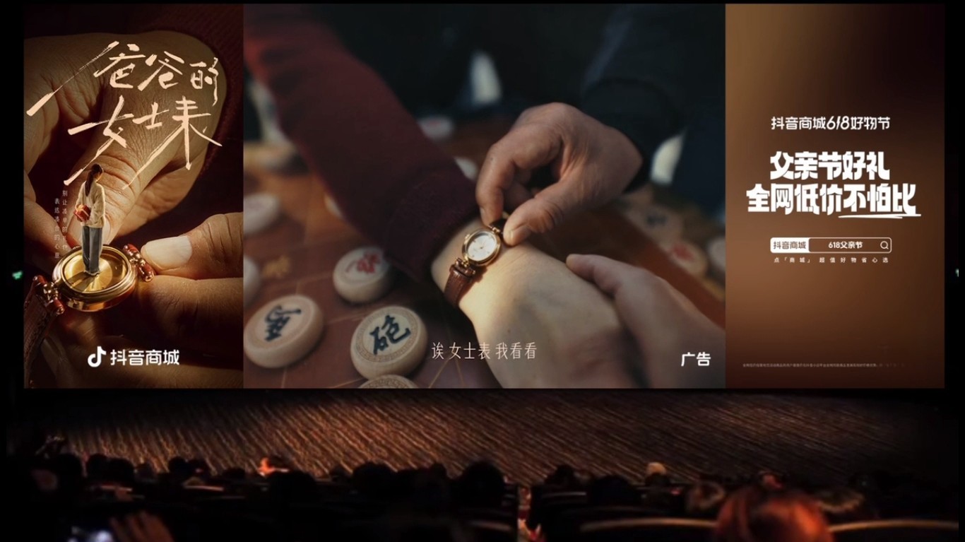 值得一提的是,这支微电影上线的渠道也尽显巧思。随着节日观影成为潮流趋势,线下影院所具备的强指向性、强到达性、强印象性等优势,是其他媒体无法媲美的。深谙此道的抖音商城,就将微电影以映前广告的形式在各大院线的大荧幕循环播放,充分利用影院资源营造沉浸式观看体验。在赚足眼泪的同时,也强化了「父亲节好礼,低价不怕比」平台优惠认知,让用户能在为爸爸挑选礼物的第一时间联想到抖音商城。