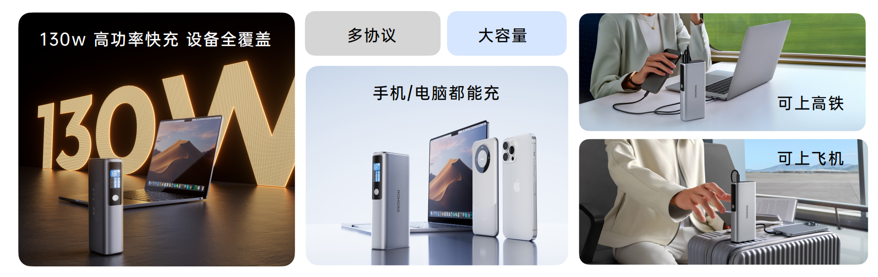 而在移动场景,则针对旅游、演唱会等场景推出更易拎易握持的小雪糕Qi2.0、PCP05/10等;针对商务出差,还推出了130W大功率的闪充棒,可以快速给笔记本补电,不影响办公效率。